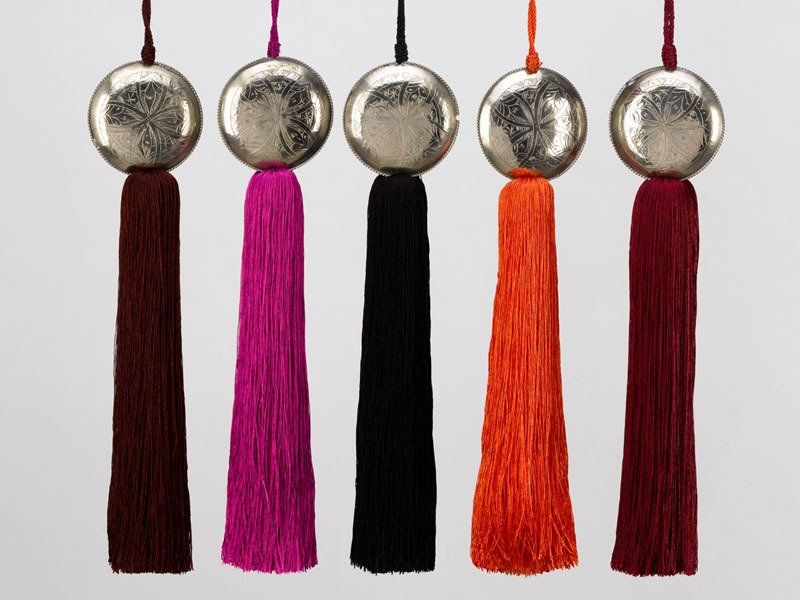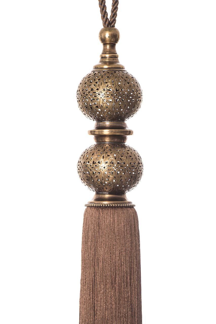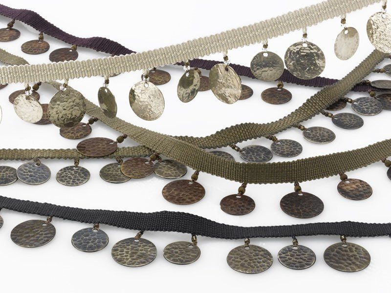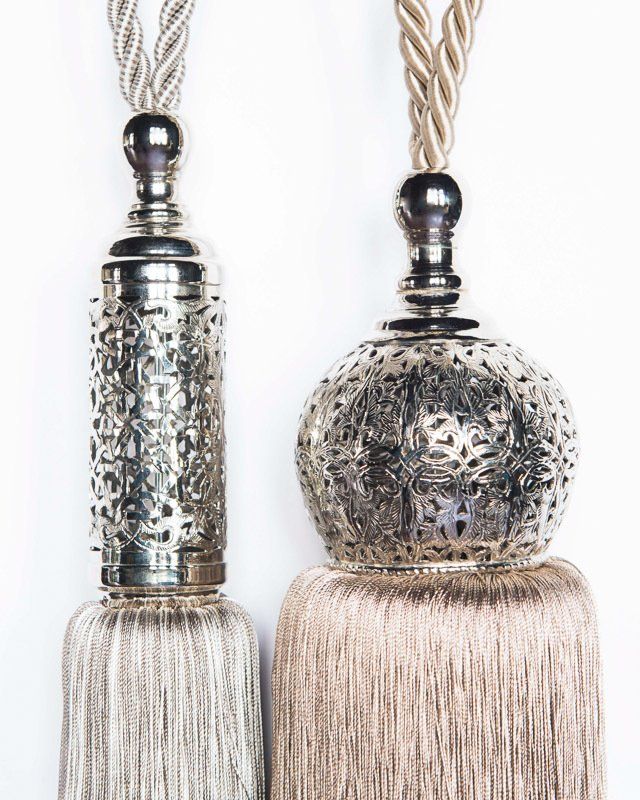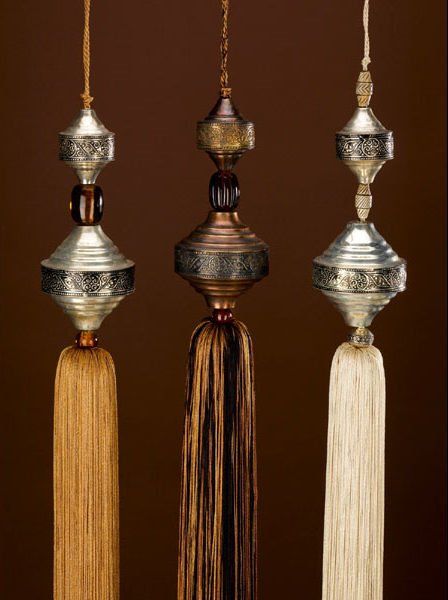 The Moroccan influence of silver etched metal designs and beaded fringes with Berber beads are a custom design range of trimmings that can be used in both a contemporary or traditional setting.